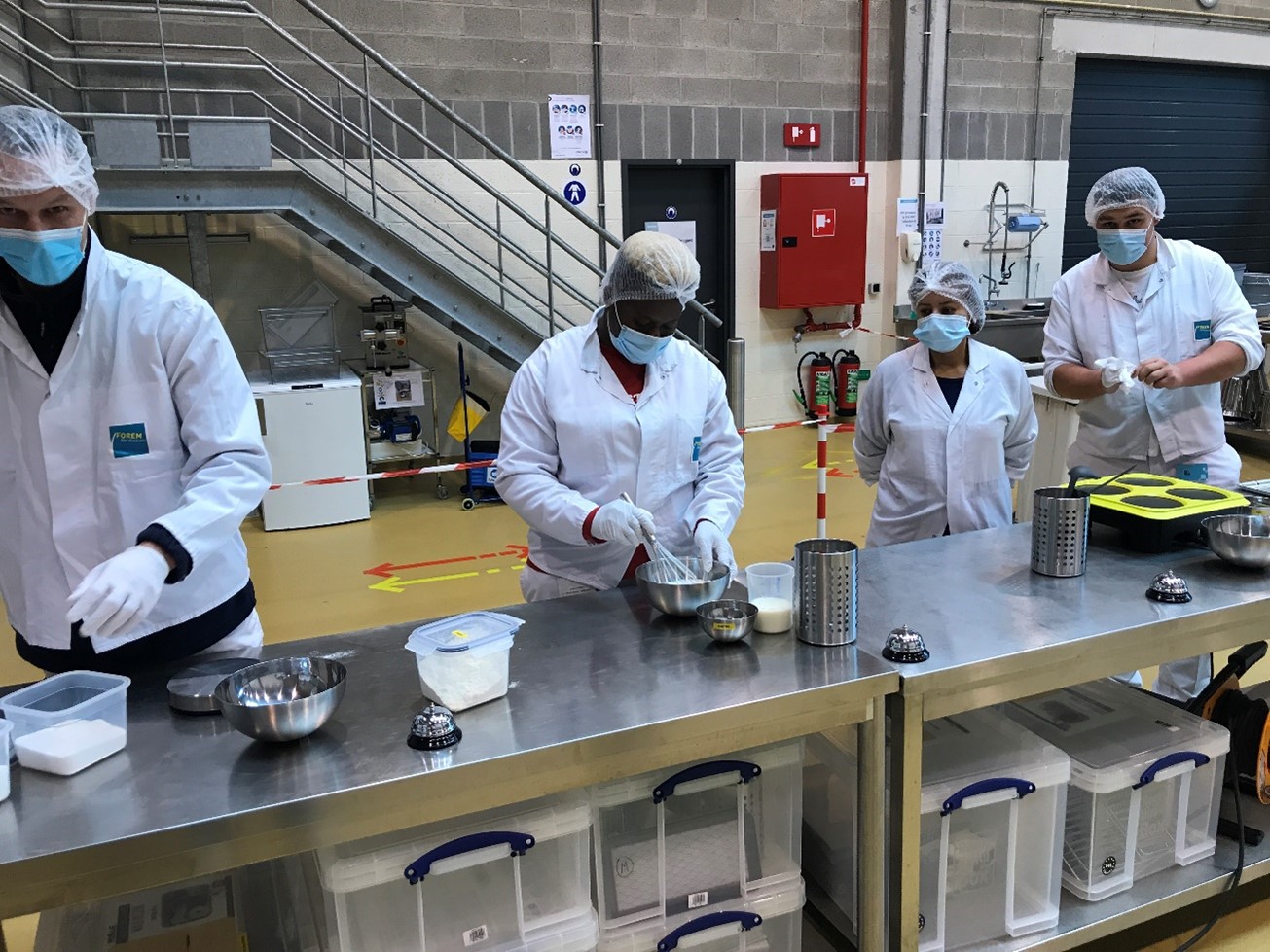 La production s’organise : dans cette vue partielle de la ligne, une personne est chargée du pesage des matières premières, une seconde de la réalisation du mix pendant que l’équipe cuisson/contrôle se prépare.